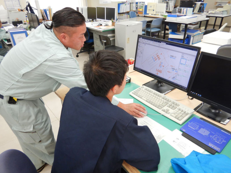 朝の出社から、オリエンテーションに始まり、実際に現地に赴いての測量体験からCAD製図作成までを体験していただきました。